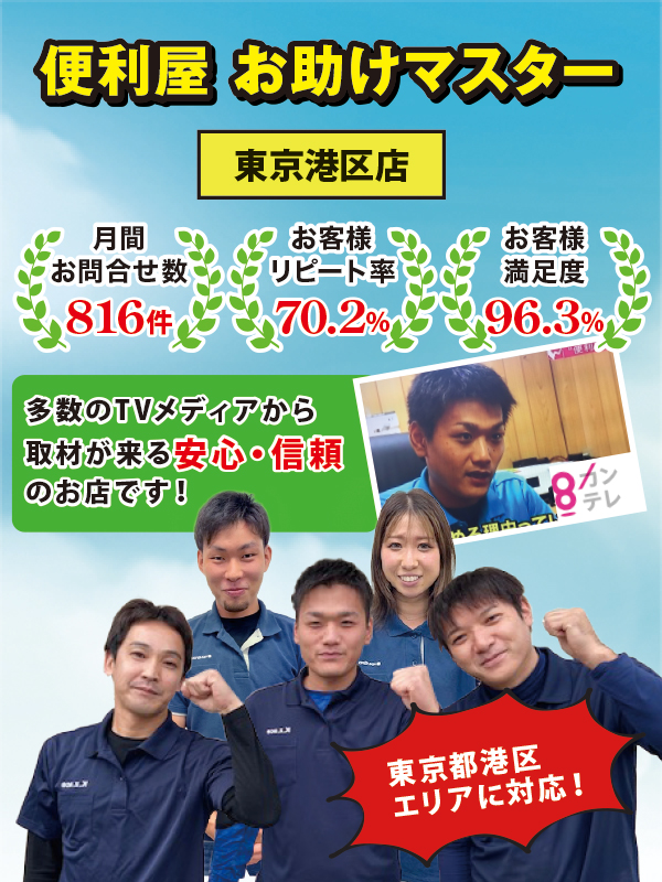 この度は便利屋お助けマスター東京港区店にご来店いただきまして誠にありがとうございます。当社では「格安」を売りにしているわけでは無く、決して大手の便利屋さんでもありません。しかし、そんな中当社をお選びいただけたお客様には必ず「選んでよかった」 と言っていただけるサービスのご提供をお約束いたします。